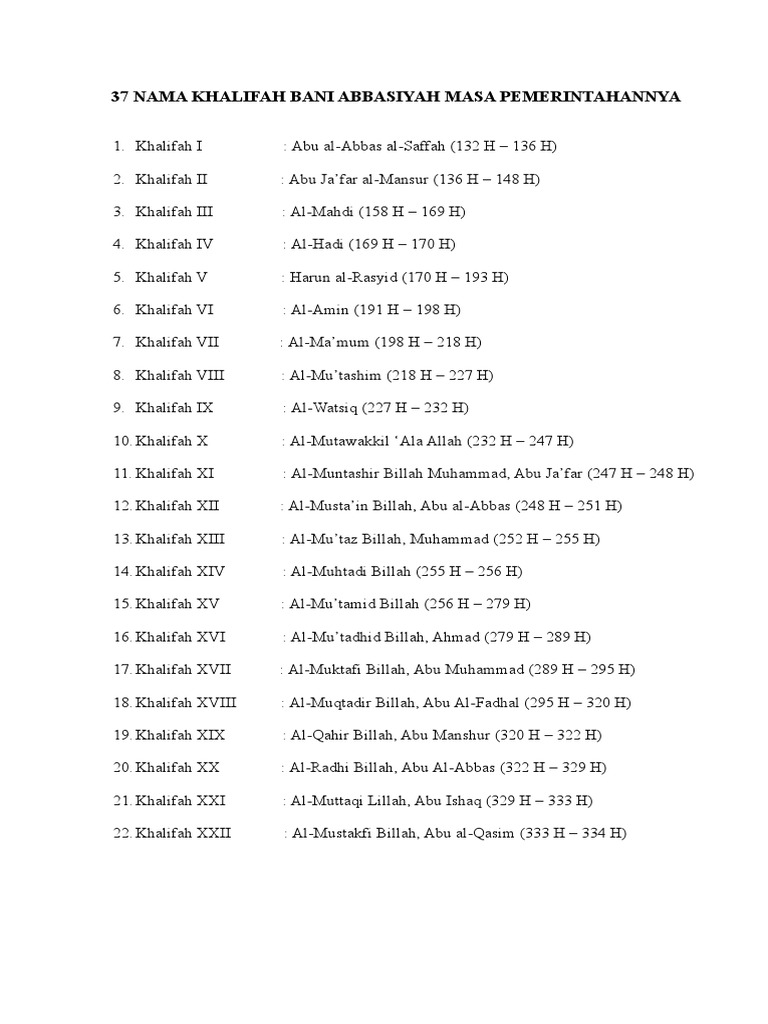 Akan tetapi ini merupakan khalifah bayangan, terbatas hanya untuk memimpin upacara dan urusan keagamaan saja. Ketiganya merupakan pendiri bani abbasiyah. 3 downloads 72 views 141kb size. Berikut adalah daftar nama 37 khalifah dinasti abbasiyah, yaitu : Revolusi bani abbasiyah berhasil menggulingkan kekuasaan bani umayyah dan menjadi dinasti kedua yang menguasai kekhalifahan islam.